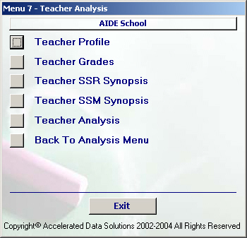 This section focuses on the teacher. Note the SSR and SSM sections in the Teacher Profile. These calculations are based on the average of the teachers' assigned student load. AIDE Variables denote the total assigned to the teacher.